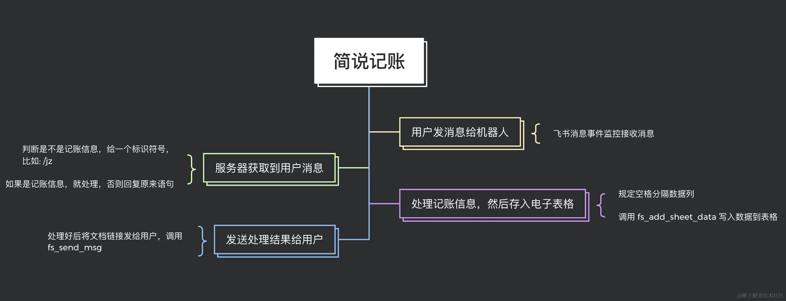 大家好,我打算每日花1小时来写一篇文章(这篇文章实际耗时约24小时,从了解飞书机器人及相关接口、权限等开始,到调通记账助手),这一小时包括文章主题思考和实现,今天是日更的第5天(结束倒计时4天,我才日更5天。。。求点赞👍),看看能不能被官方推荐。