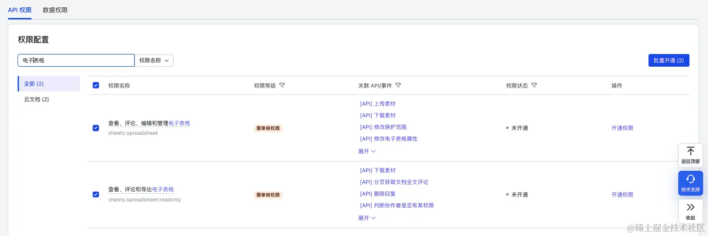 点击左侧的权限管理,搜索电子表格,将相关的两个权限勾选开通。