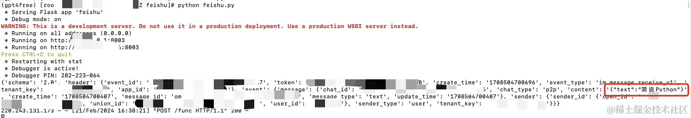 这时我们从飞书发送消息给机器人,我们就可以在服务器获取到对应消息了。