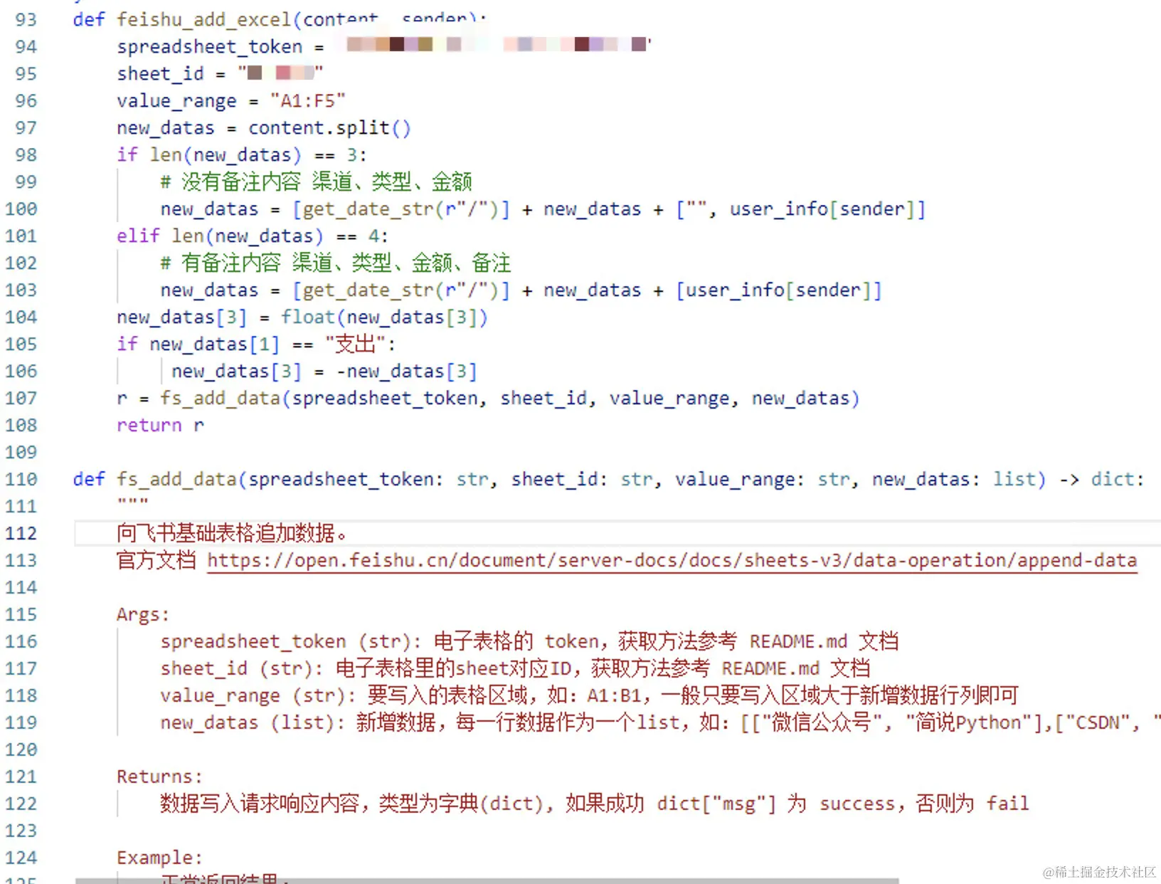 2、机器人识别到关键词,调用飞书记账功能函数,在该函数中对收到内容进行解析,并调用飞书文档接口,将内容写入飞书文档。