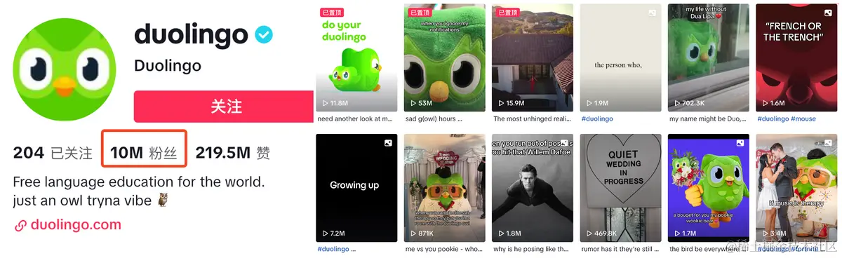 不夸张地说,多邻国可以说是全球最爱做也最会做TikTok营销的教育软件了。在看到数据前,你绝对想不到多邻国从建立账号开始运营,到TikTok坐拥百万粉丝只用了两年不到……而现在,多邻国的TT视频平均播放量已经超过300万,媲美甚至超过许多顶级网红。