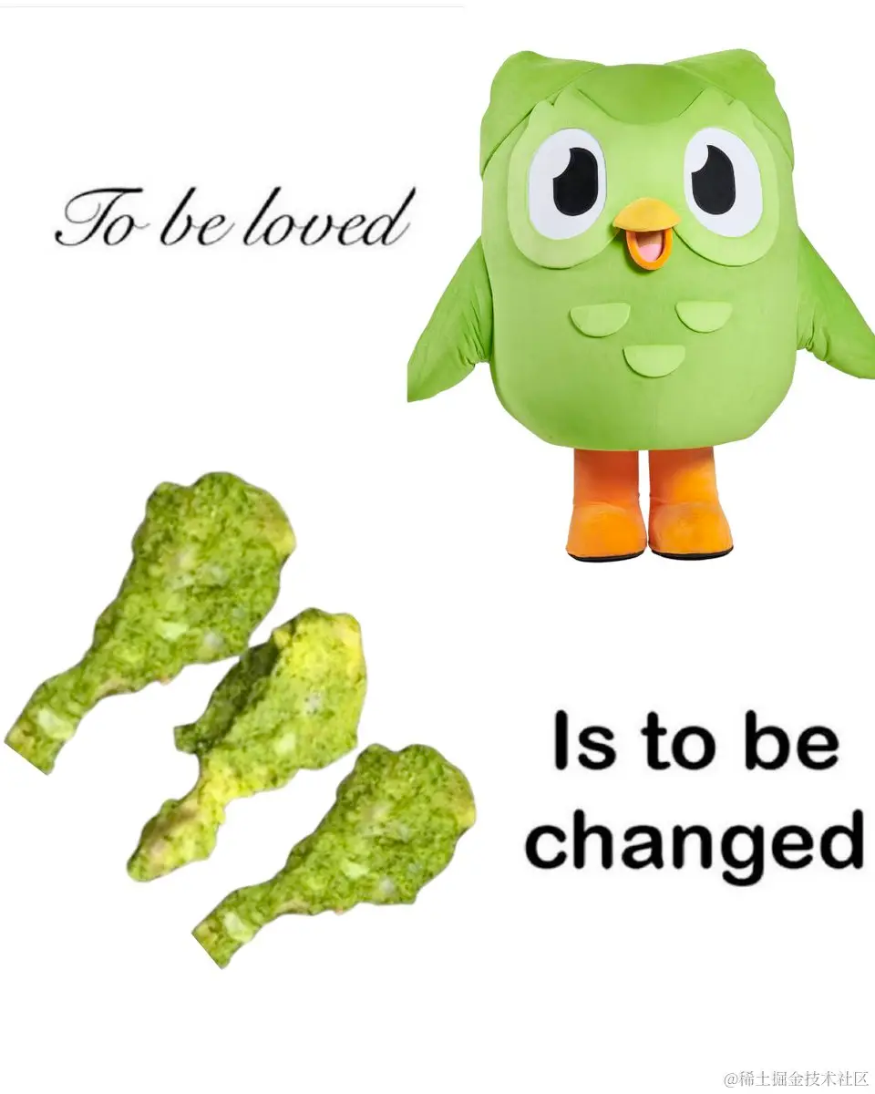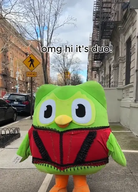 在内容选择上,多邻国早期曾尝试过比较常规的应用推荐、博主试用、试用技巧等一系列宣传内容,但是毫无水花。此后,多邻国营销就仿佛打通了任督二脉,靠发疯玩梗走出了自己的成名之路。注意看,这只经常在各种表情包、短视频中出镜的绿色猫头鹰正是多邻国的品牌形象物多儿(duo)。