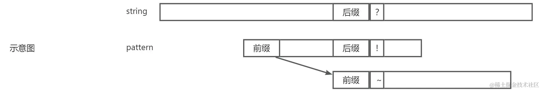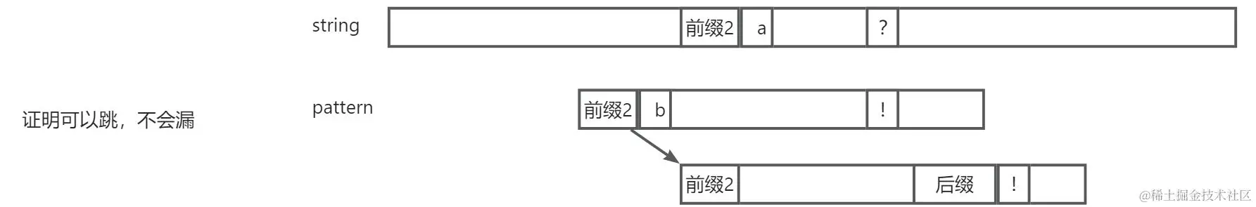假设现在的情况是,我匹配进pattern,但是匹到?和!的地方不一样了。假设恰好我就是知道(tip:这个是可以提前算出来的,下面说)此时pattern前面这一子串里有一节相同的前缀和后缀;由于我们是匹配到这的,string和pattern的后缀也一定是一样的,所以这个前缀和string的后缀也是一样的。那么接下来的匹配,我就可以把前缀搬过来,直接匹配?和前缀后的下一个字符了。这个就是kmp的原理。