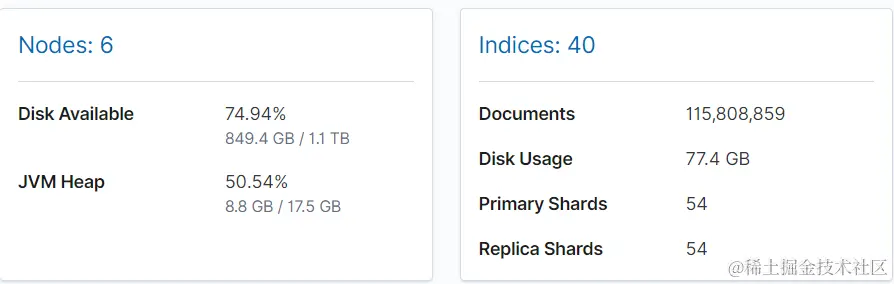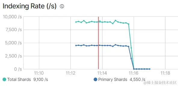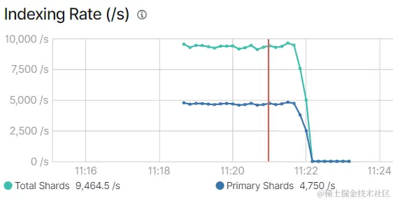 1000万到2000万:程序耗时1778.45秒。 最终通过ES查询索引元数据观察到索引操作累计耗时是1215秒。 其余的时间多是python程序自身运行的占用。 2000万到3000万:程序耗时1904.99秒;索引累计耗时2026秒。 3000万到4000万:程序耗时1904.99秒;索引累计耗时2026秒。 4000万到5000万:程序耗时1904.99秒;索引累计耗时2026秒。 那么,最后1000万数据实际入库索引速度是11025/s。