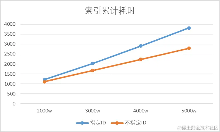 综上,指定ID写入对性能的负面影响随着数据量增长而增大。数据显示在5000万级别性能已损失了63%。