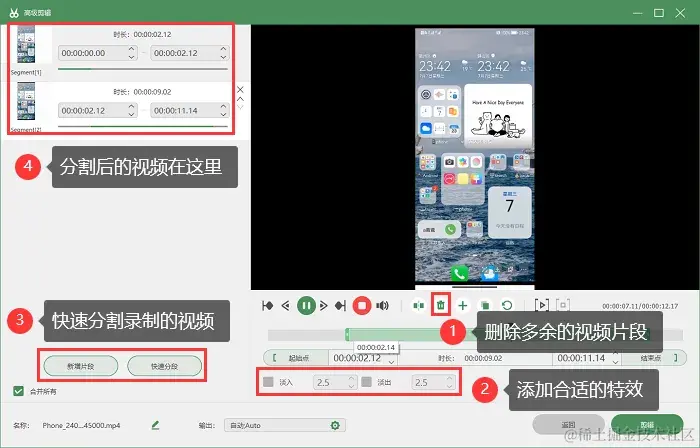 第3步:开始录屏后,软件将录制您的华为p30屏幕内容。录制完成后,点击 “结束” 按钮,保存录制文件,你还可以对视频进行裁剪、删除等操作。