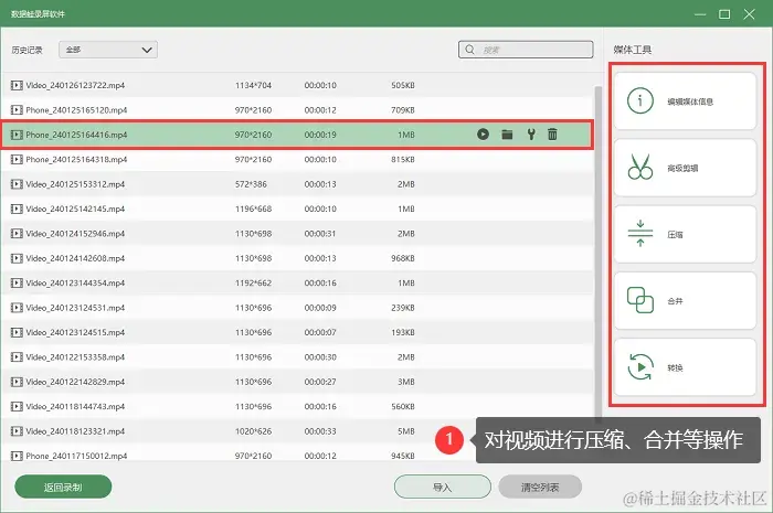 第4步:此外,在历史记录页面,你还可以找到之前录制过的手机视频,对它进行压缩、转换、编辑媒体信息等操作。