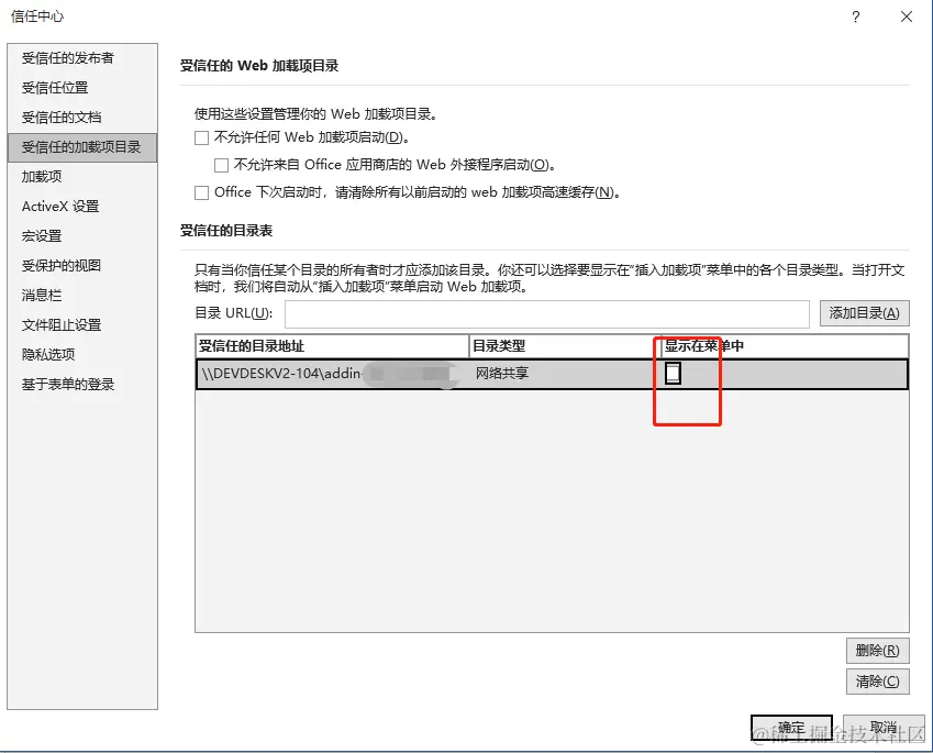 选择“受信任的加载项目录”,取消“显示在菜单中”复选框