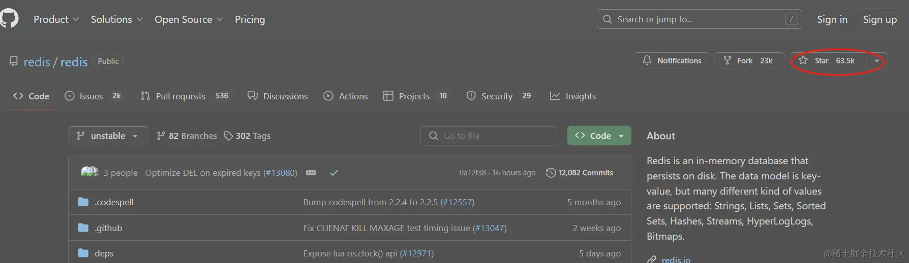 Redis的GitHub仓库是github.com/redis/redis,截至2024年2月,它的星数是63.5k。