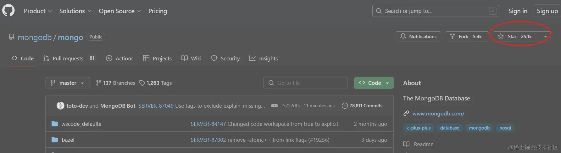 MongoDB的GitHub仓库是github.com/mongodb/mongo,截至2024年2月,它的星数是25.1k。