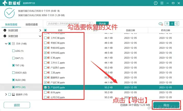 第3步:在软件扫描完成后,会默认按类型查看数据,用户可以选择需要查看的文件类型并对数据进行查看,在查看时,看到需要恢复的文件可以直接将其勾选上,勾选完毕后,点击【导出】,并选择另一个磁盘作为文件导出后的保存位置。