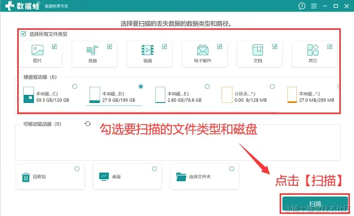 第2步:在软件的选择界面,可以勾选上误删的文件类型(即要扫描的文件类型),并勾选上文件误删前所在的磁盘,点击【扫描】,软件将对磁盘进行扫描;
