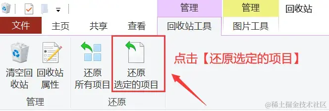 第2步:在回收站中定位到误删的文件,选中它后,点击 【还原选定的项目】 。