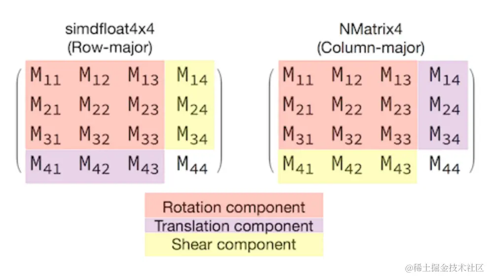 其对应的变换矩阵形式如下,不同部分表示不同的变换。其中位移部分较容易获得(紫色部分)。图片来源