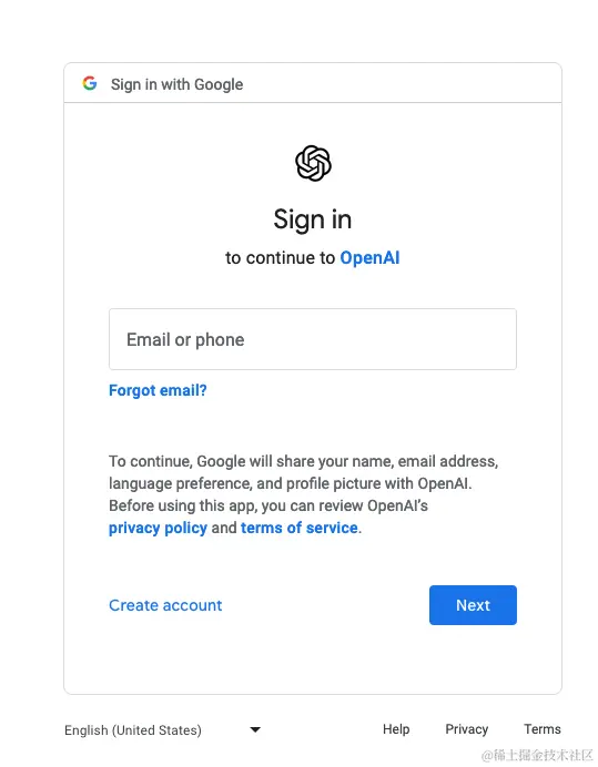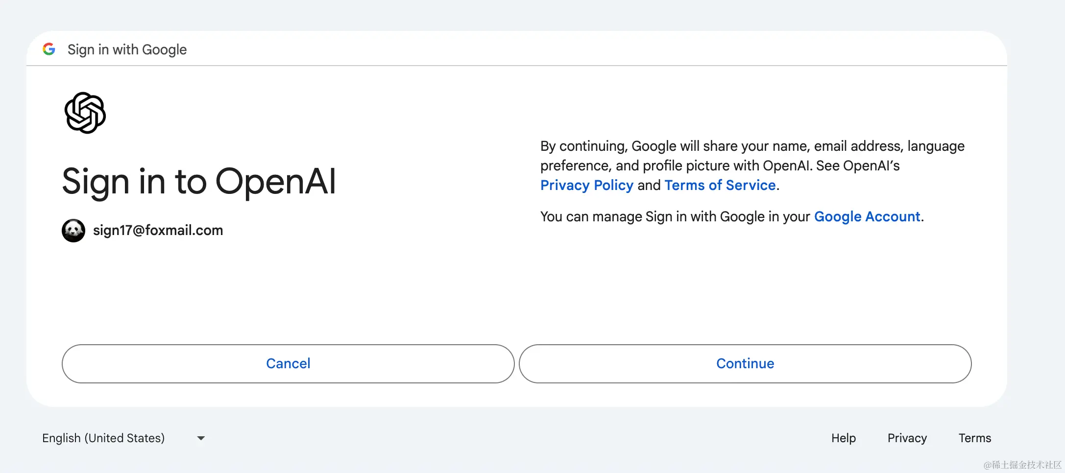 这里会提示我们会使用谷歌账号的信息去创建 ChatGPT 账号,我们点击 Continue 继续下一步。