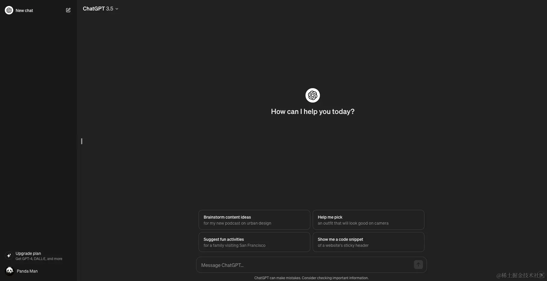 主界面左侧是我们的会话列表,可以随时新增与切换会话,在下方的输入框中输入你的对话内容就可以与 ChatGPT 进行对话啦。