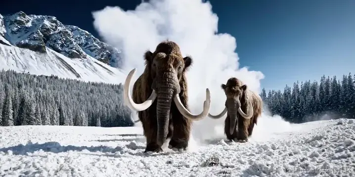 翻译:几只巨大的长毛猛犸象踏过一片雪白的草地,它们长长的毛发在微风中轻轻飘动着,远处覆盖着雪的树木和雄伟的雪山,午后的光线下有些薄云,太阳高悬在远方,营造出温暖的光芒。低角度的摄影视角令人惊叹,捕捉到了这些大型毛茸茸的哺乳动物,画面景深感强烈。