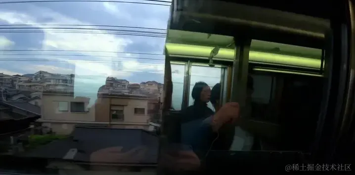 翻译:一辆列车穿越东京郊区时,窗户上的倒影。