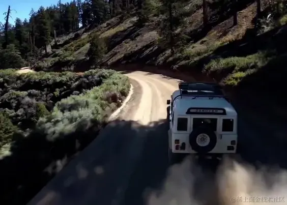翻译:摄像机跟随一辆白色老式SUV,顶部有黑色行李架,它加速通过一条陡峭的土路,周围是松树,地势陡峭,车轮卷起了尘土,阳光照射在SUV上,它沿着土路飞驰,给场景增添了温暖的光芒。土路在远处轻轻弯曲,看不到其他车辆。路边的树是红杉,绿色的植物点缀其中。汽车从后方的镜头中轻松地跟随着曲线,使其看起来好像在崎岖的地形中轻松驾驶。土路周围是陡峭的山丘和山脉,天空晴朗,偶有薄云飘过。
