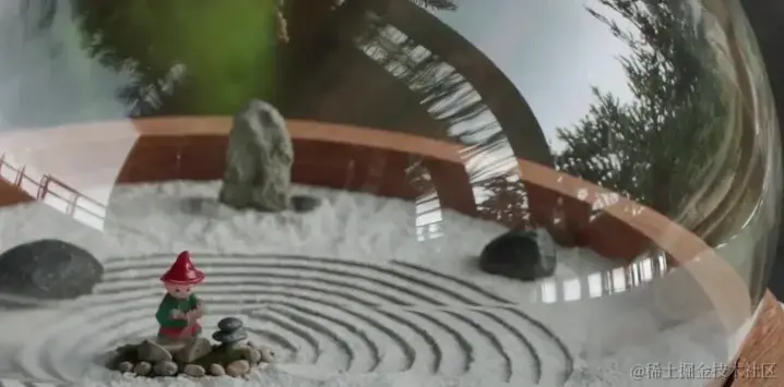 翻译:放大观看一个玻璃球,里面有一个禅宗花园。球内有一个小矮人,他正在用耙子整理禅宗花园,并在沙地上创造出图案。