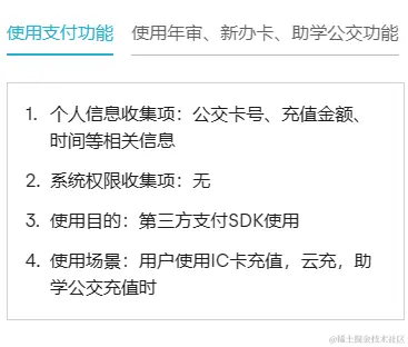 <p>使用场景:用户同意获取权限后,使用公交卡年审、新办卡、助学公交时</p>