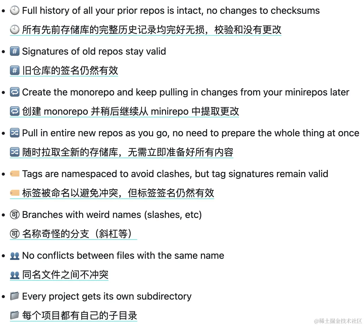 tomono是一个代码库迁移工具,可以很方便的将multiplerepo的代码迁移至monorepo,并且保留所有分支和历史提交记录,有很多特性: