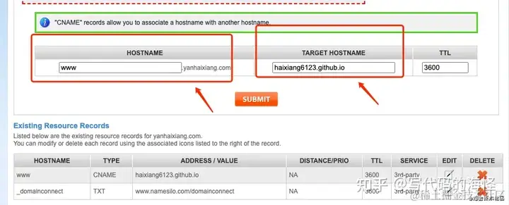 首先,添加一个 CNAME,将域名指向原来丑陋的 username.github.io。访问你的域名相当于访问了 username.github.io: