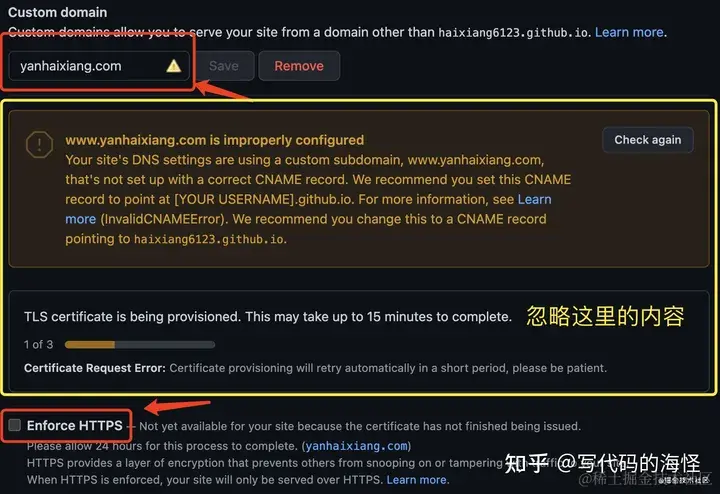 在里面的 Custom Domain 里填你的域名,并点开 Enforce HTTPS。