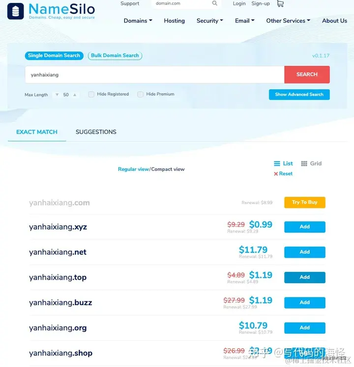 国外比较出名的域名服务商有 Godaddy 和 NameSilo ,我自己是在 NameSilo 上购买的。为什么选它?主要是便宜。