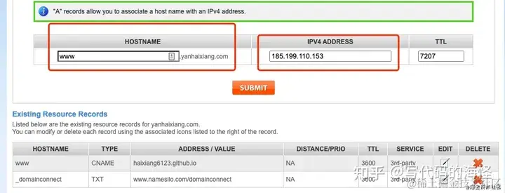 - 添加 DNS 配置,将域名指向 Github 的静态网页