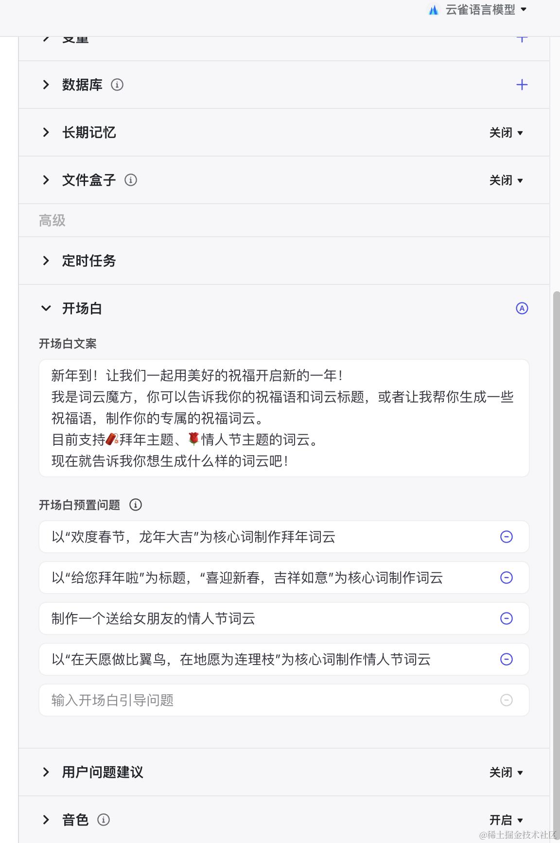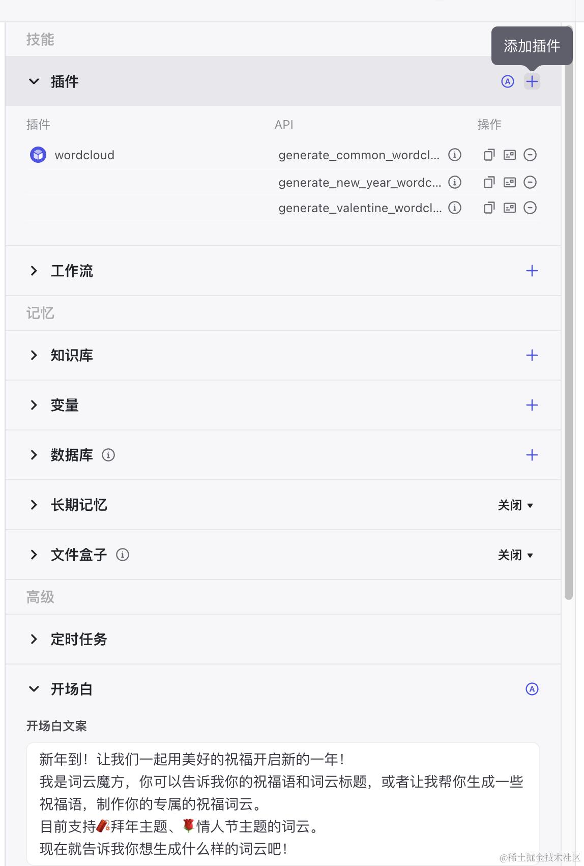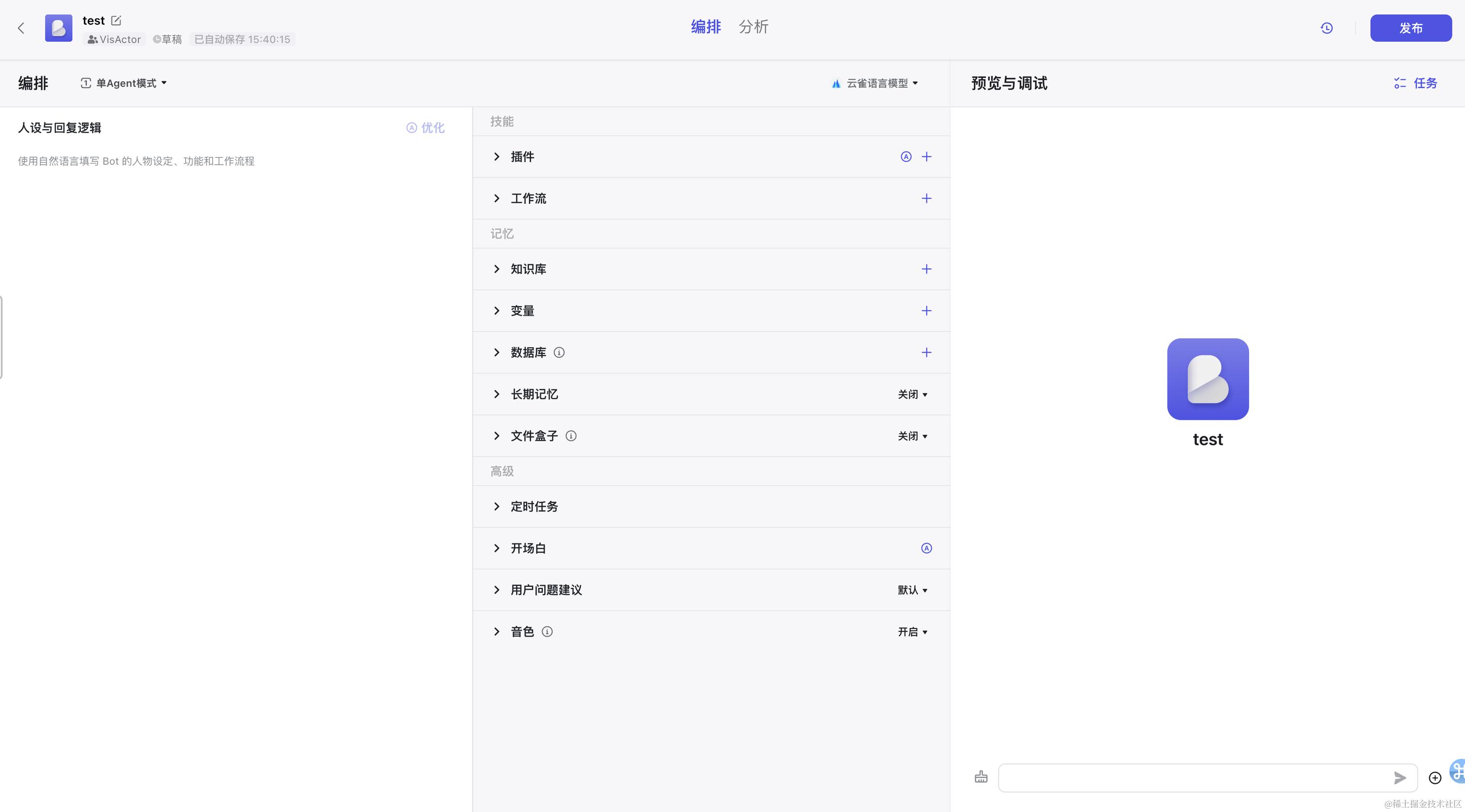 在bot编辑页面中间的“技能”栏目中,我们可以为bot指定插件、工作流等外部资源;在“记忆”栏目中,可以添加知识库和长期记忆选项。在“高级”栏目中,我们可以为bot设置开场白和预置问题,这将会在用户第一次打开bot时进行展示。我们可以在其中教会用户如何使用你的bot,并进行一定的引导。