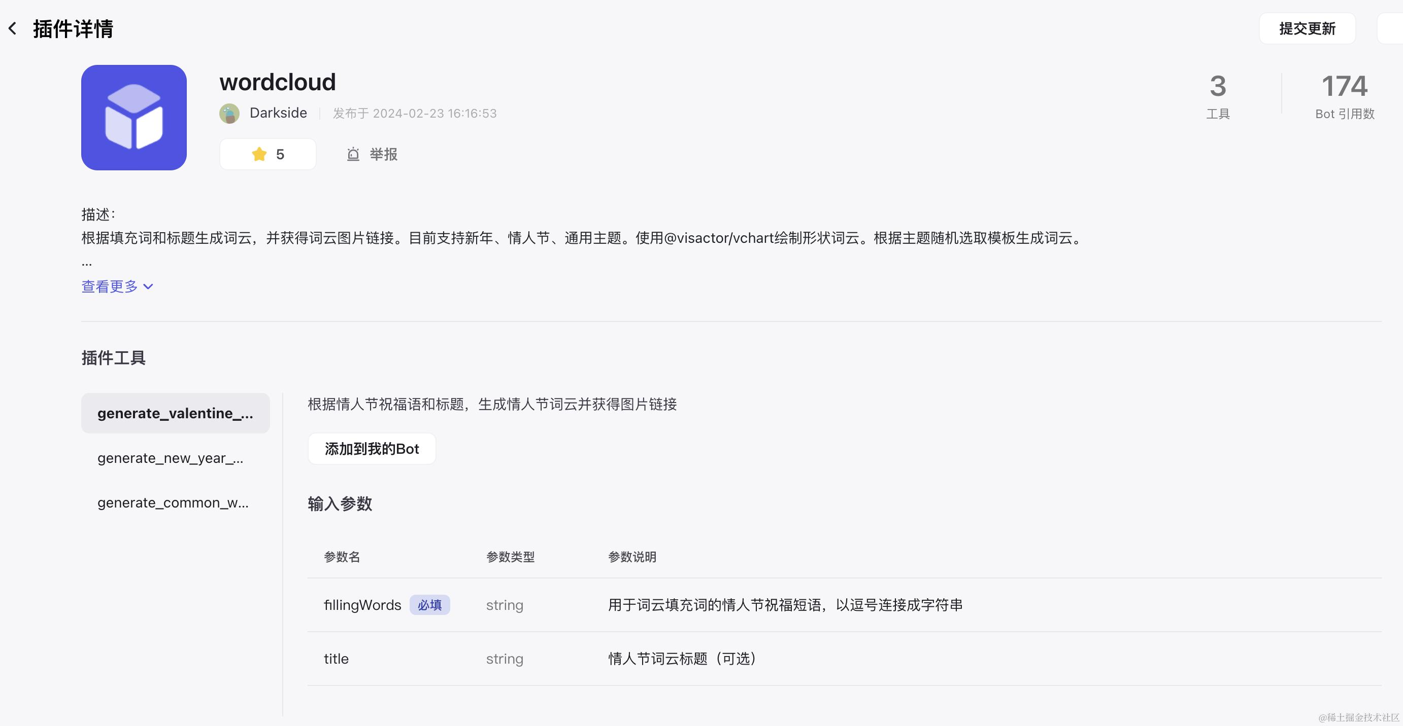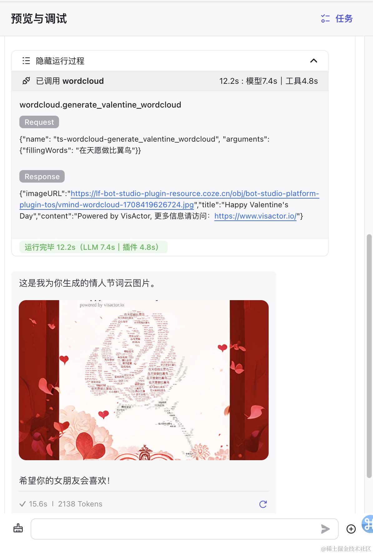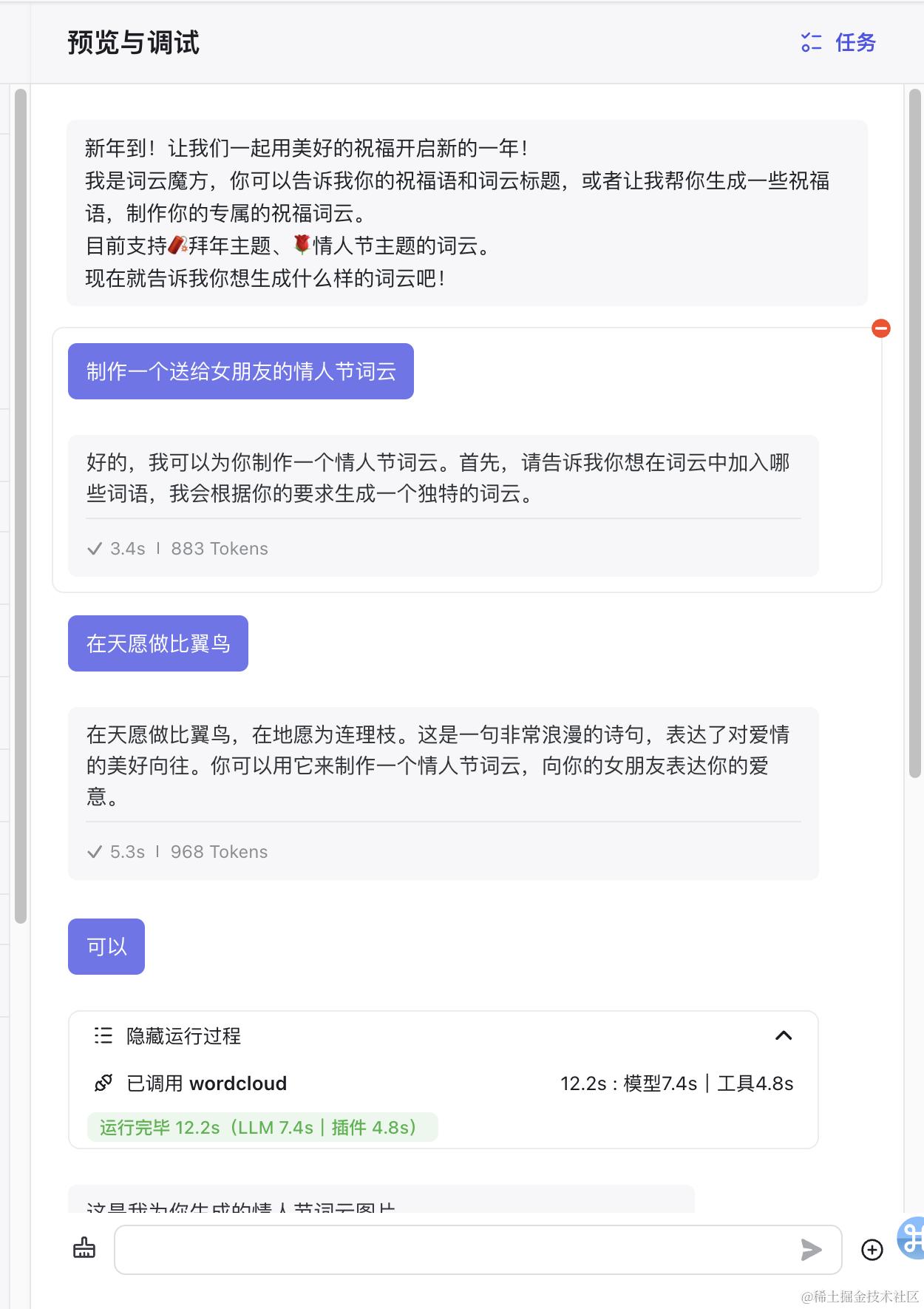 将wordcloud插件下的三个工具添加到bot中,我们可以在右侧的“预览与调试”栏目与bot进行对话,测试bot能否成功调用插件。