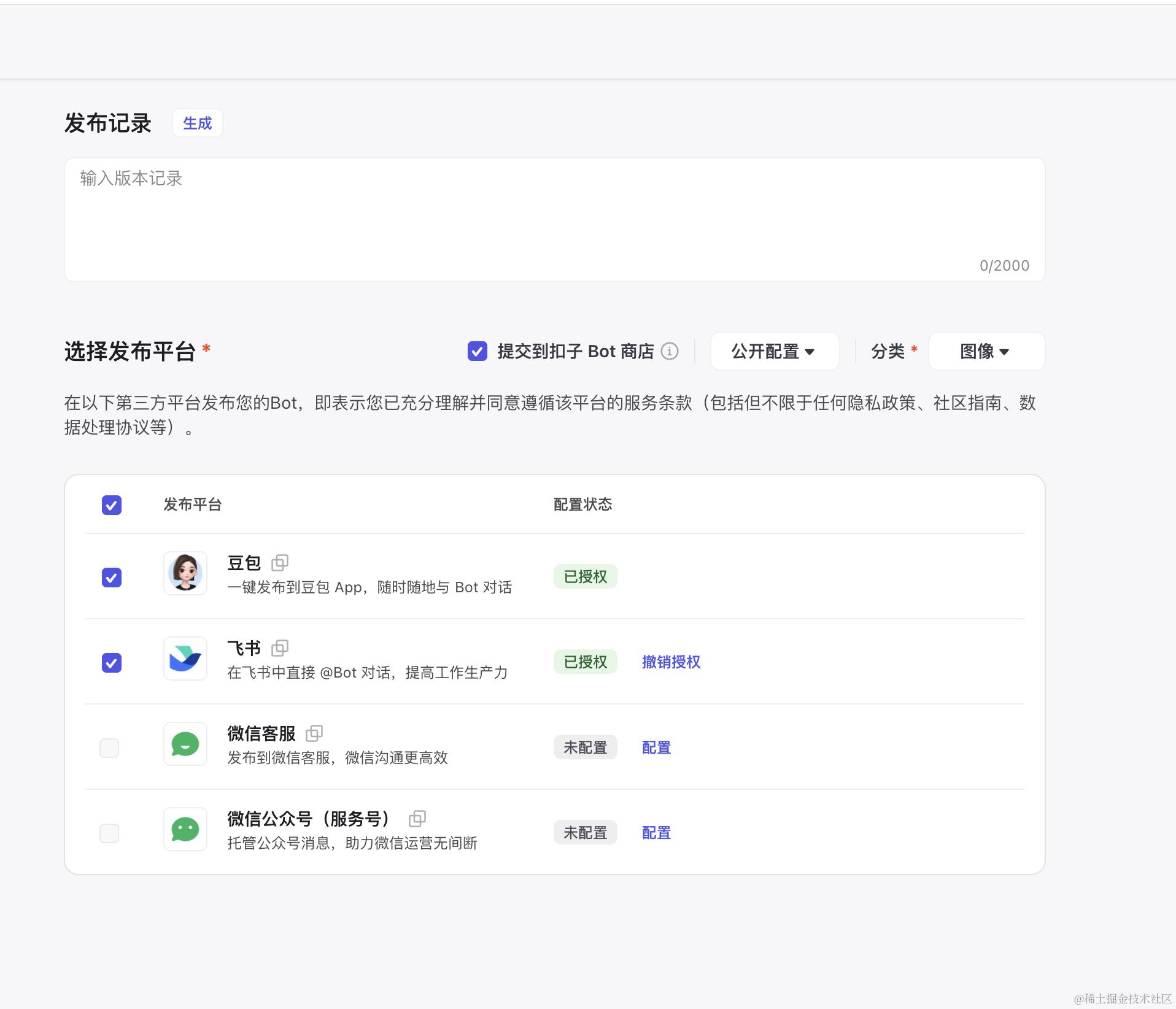 bot调试完成后,我们可以点击右上角的“发布”按钮,输入相关信息,将bot发布到相关平台。我们还可以勾选“提交到扣子Bot商店”,使更多人可以使用你的bot。