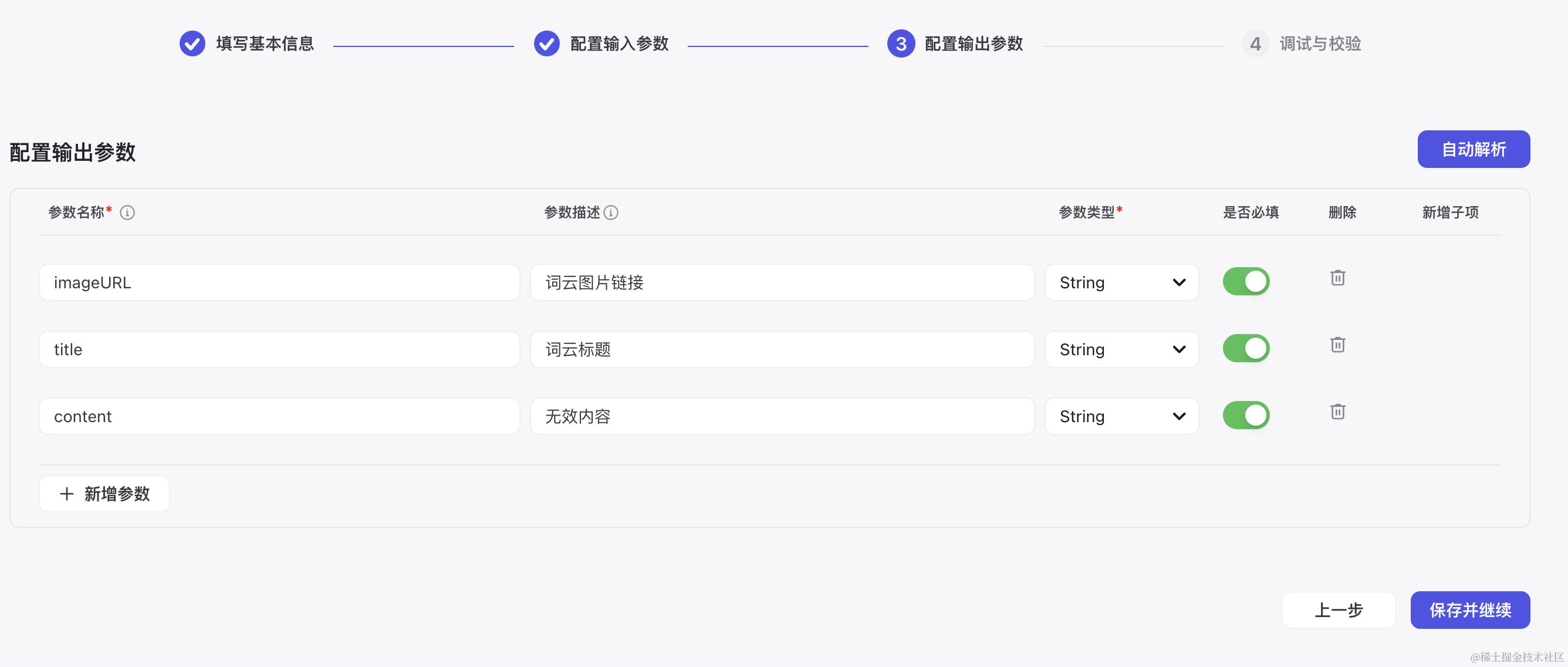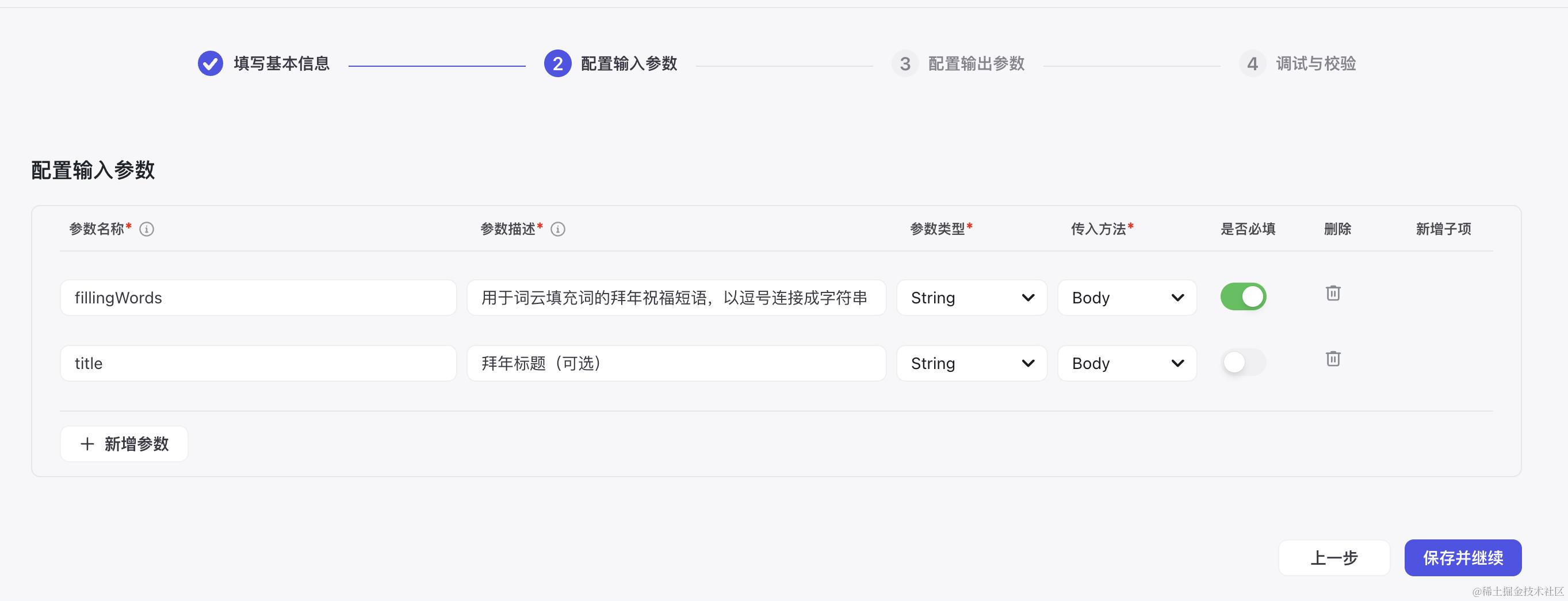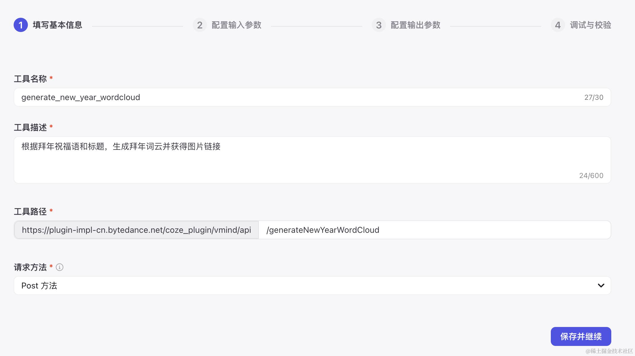 创建插件后,需要继续创建工具,供模型进行调用。插件是具有相同url的API的集合,一个工具就是一个具体的API,是供模型调用的最小单位。模型通过“插件名称.工具名称”的形式进行插件调用。点击右上角的“创建工具”按钮,输入工具名称、工具描述、工具路径,以及工具的输入和输出参数,并进行调试与校验。注意在调试通过后才能进行插件的发布。