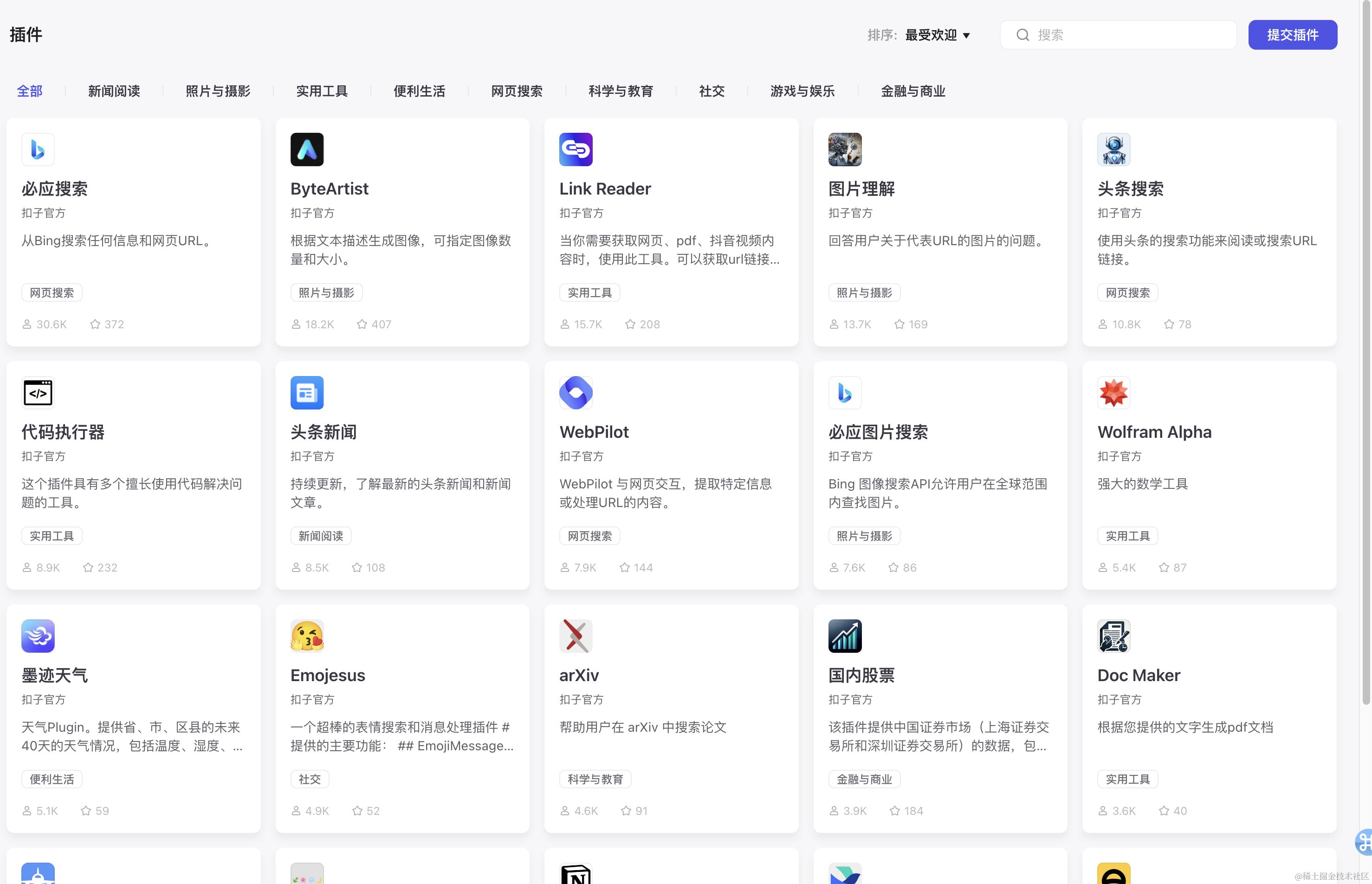 coze平台提供了“插件”能力。一个插件就是一系列的外部API,bot在后续交互中将在合适的时机调用插件,并使用插件返回的结果完成后续任务。在coze插件商店中,展示了当前可用的插件。