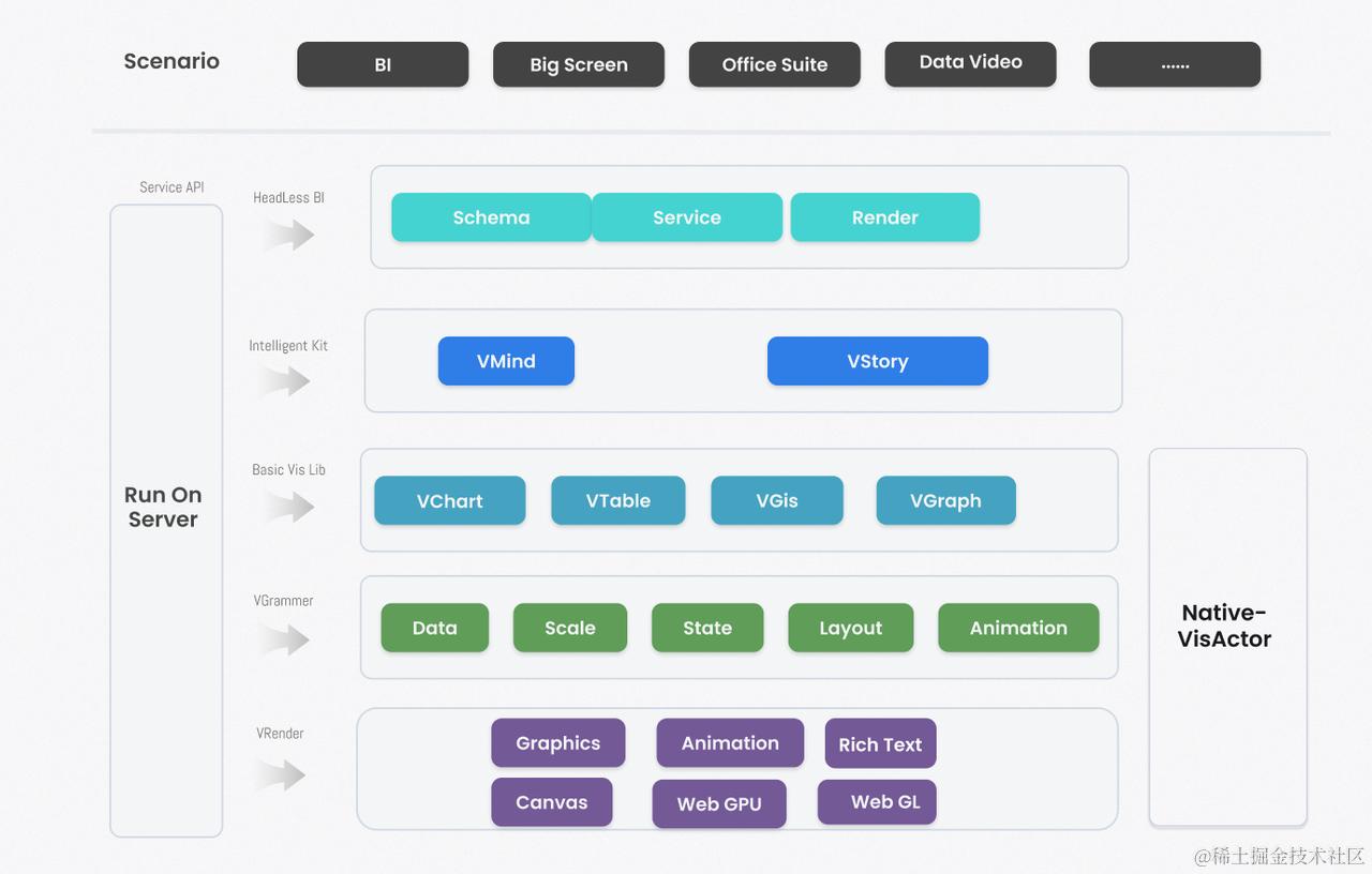 VisActor 是从字节跳动大量可视化场景沉淀而来。在覆盖常规可视化场景的同时,以叙事可视化为新的着力点,以智能可视化为目标,形成了包括渲染引擎、可视化语法、数据分析组件、图表组件、表格组件、GIS组件、图可视化组件、智能组件等多个模块以及周边生态组成的可视化解决方案。