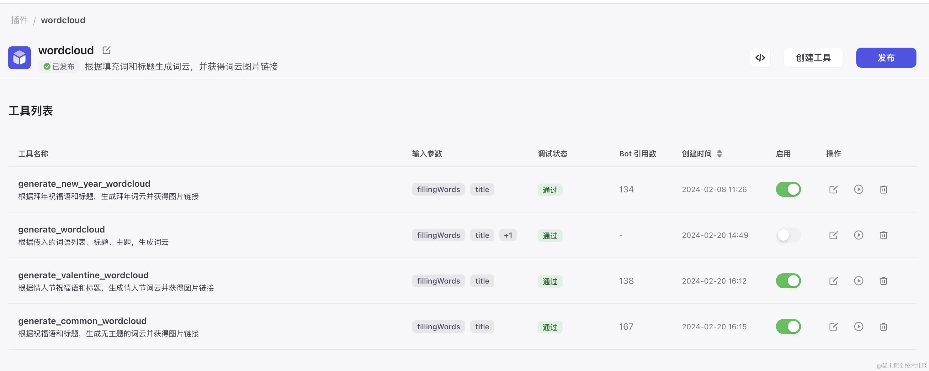 插件需要发布后才能供bot使用。点击插件详情页的“发布”按钮,可对插件进行发布。