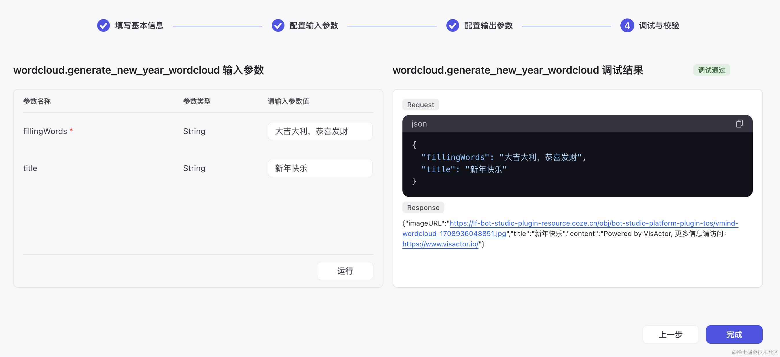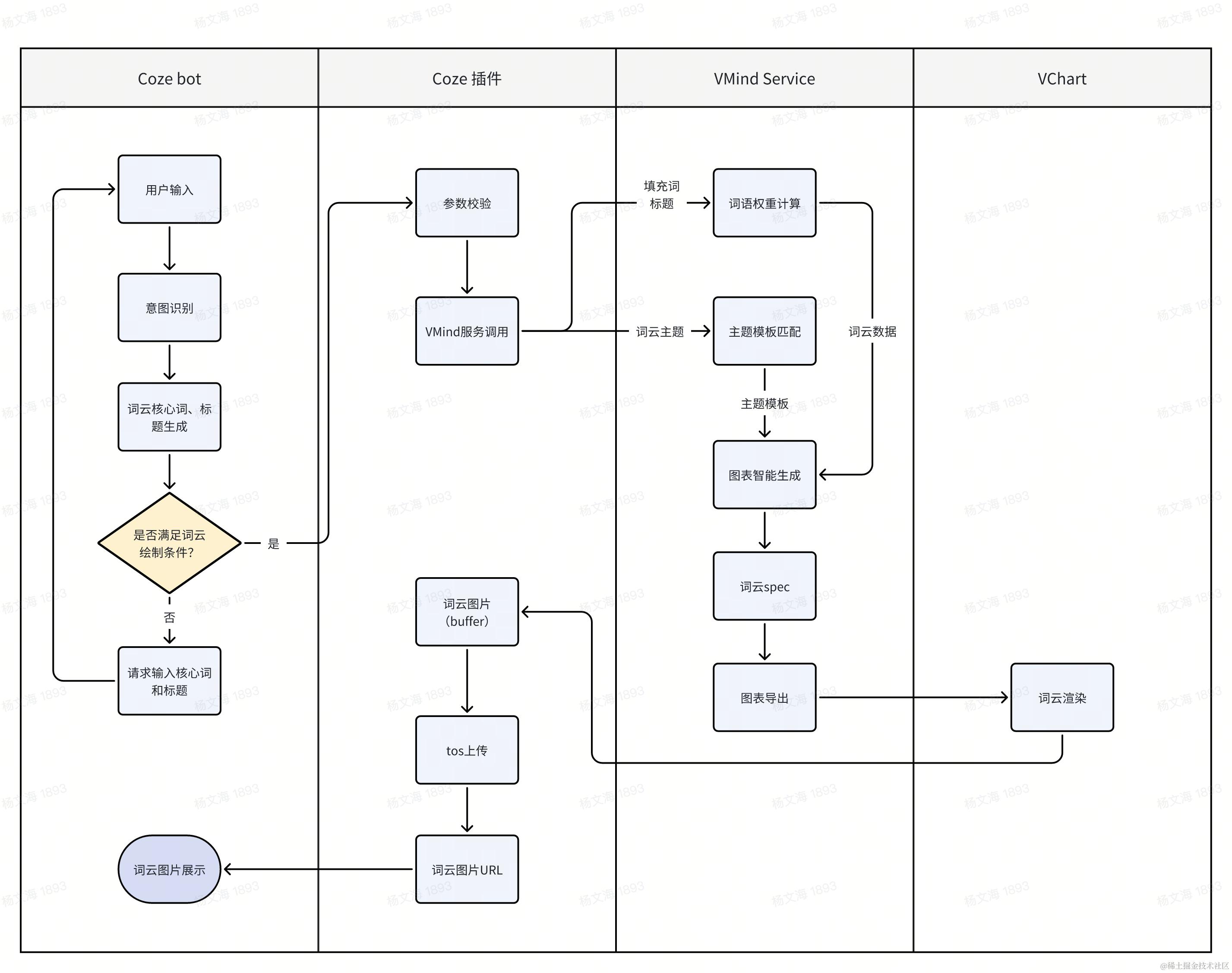 VMind 会根据传入的参数自动生成VChart spec,并调用VChart 渲染图片,上传到cdn,返回图片地址给 Coze 的wordcloud 插件。