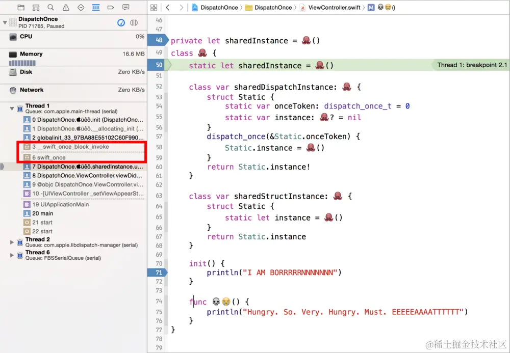 实例的堆栈跟踪。红色的部分是我们感兴趣的东西。在 Kraken 单例的实际初始化执行之前,有一个标记为 swift_once