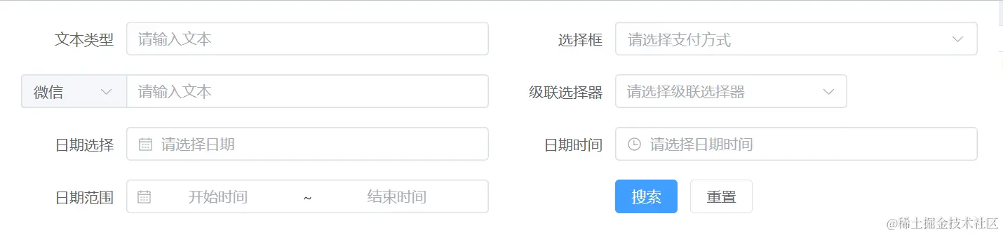 type?: 'input' | 'select' | 'cascader' | 'date' | 'datetime' | 'daterange' | 'inputSelect' //表单项类型