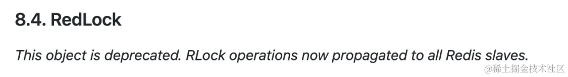 因为 RedLock 存在的问题争议较大,且没有完美的解决方案,所以 Redisson 中已经废弃了 RedLock,这一点在 Redisson 官方文档中能找到,如下图所示: