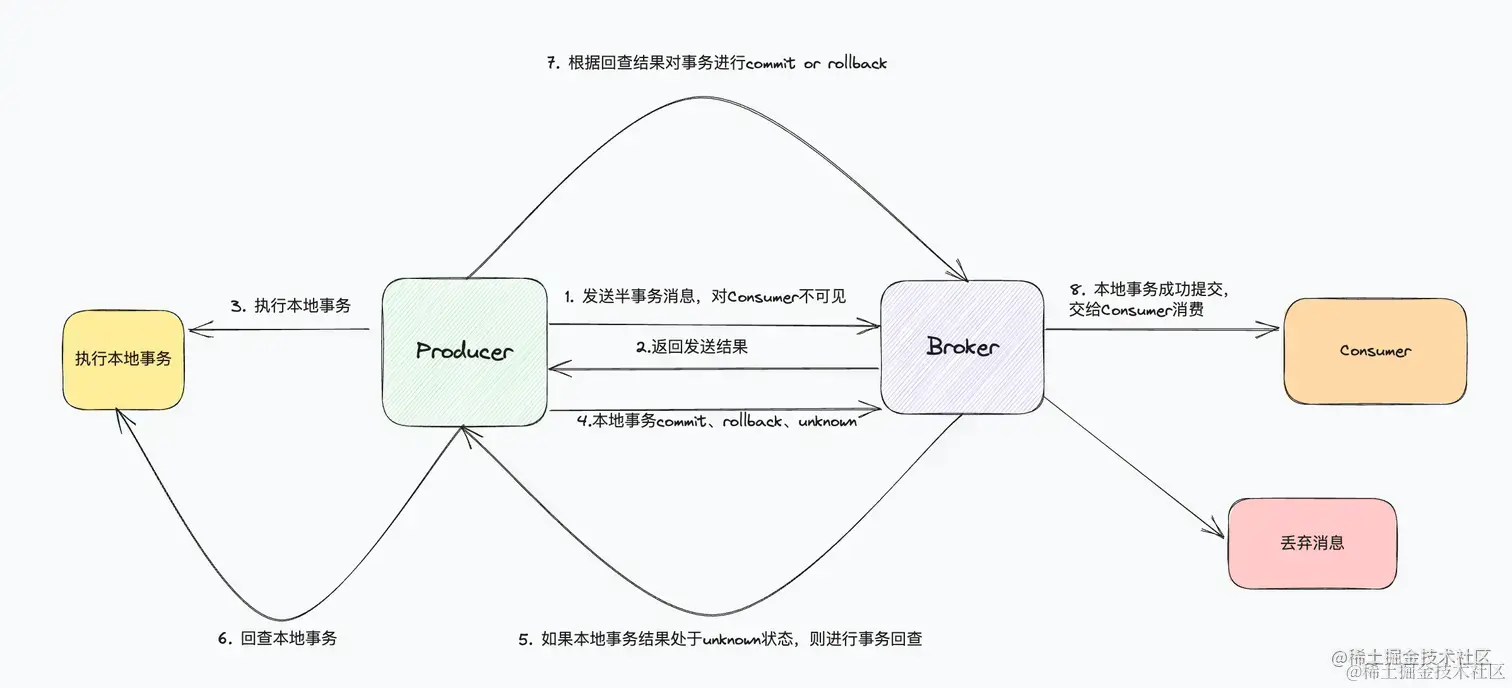 - 告诉Broker执行结果 本地事务执行成功,将消息替换为原始的Topic,暴露给Consumer 本地事务执行失败,回滚事务 本地事务执行结果unknown,则进行事务回查