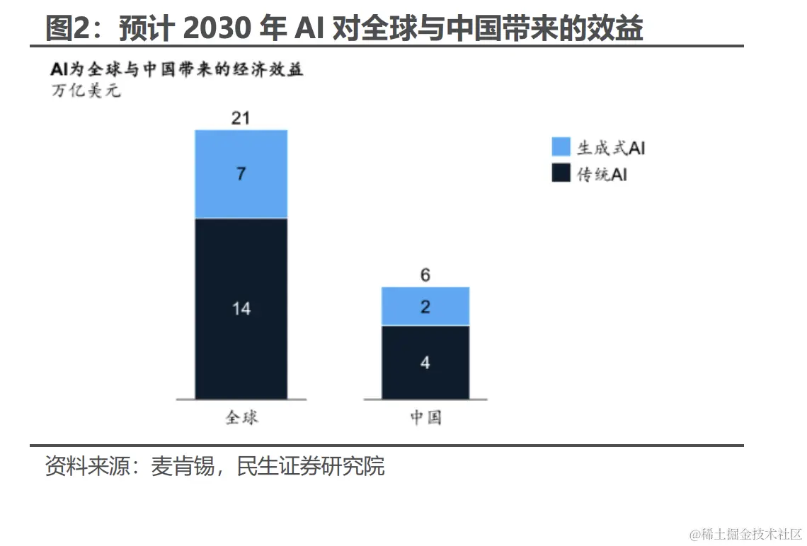 作为 AI 研发高地的中国,将凭借战略性投资分享生成式 AI 总效益的 1/3。