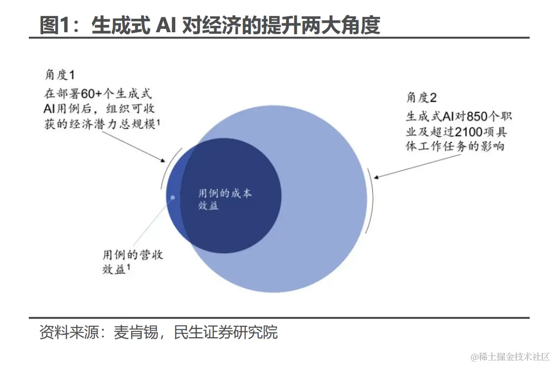 据麦肯锡,生成式 AI 可以从赋能传统业务和创造新业务两 个角度提振经济,在重塑千行百业、不同职能的知识型工作的同时,助推营销与销售、客户运营、软件开发等关键领域的岗位转型与绩效提升,进而在 2030 年为全球经济贡献 7 万亿美元的价值,比传统 AI 或分析的潜在经济效益高出 50%。