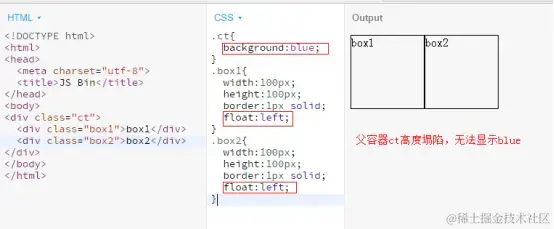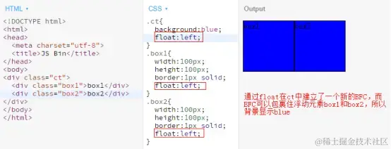 方法4:BFC(块级格式化上下文)“清理”浮动,对于嵌套元素,子元素浮动会对父容器产生影响,我们可以通过BFC这种方式,令父容器包含浮动子元素。实现BFC有多种方式,(参考MDN、参考W3)。但是使用这种方法也是有影响或者是局限性,例如使用display: inline-block,会缩短父容器长度。