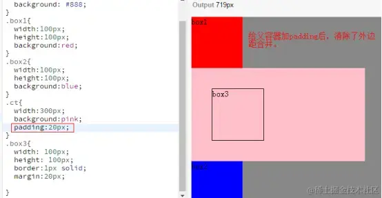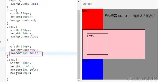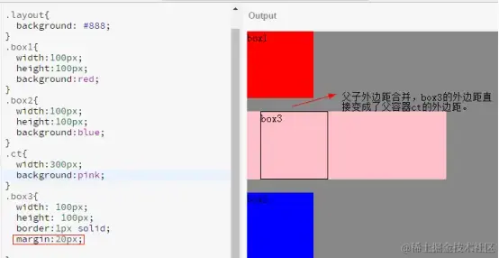 父子外边距合并例子: 对于嵌套元素的外边距合并,在父元素中形成BFC,或者父元素加padding或者border等填充内容。