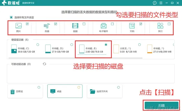 步骤2:在对文件类型进行选择时,可以只勾选上某个需要扫描的文件类型,也可以直接全选,同时勾选上要扫描的磁盘,点击【扫描】;