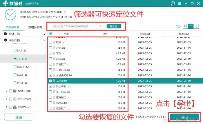 步骤3:扫描完成后,软件默认按类型对数据进行查看,可以选择需要查看的文件类型,在右侧对结果进行查看,如果文件呈现比较多,也可以选择在 【筛选器】中快速定位文件,完成文件选择后,点击【导出】。
