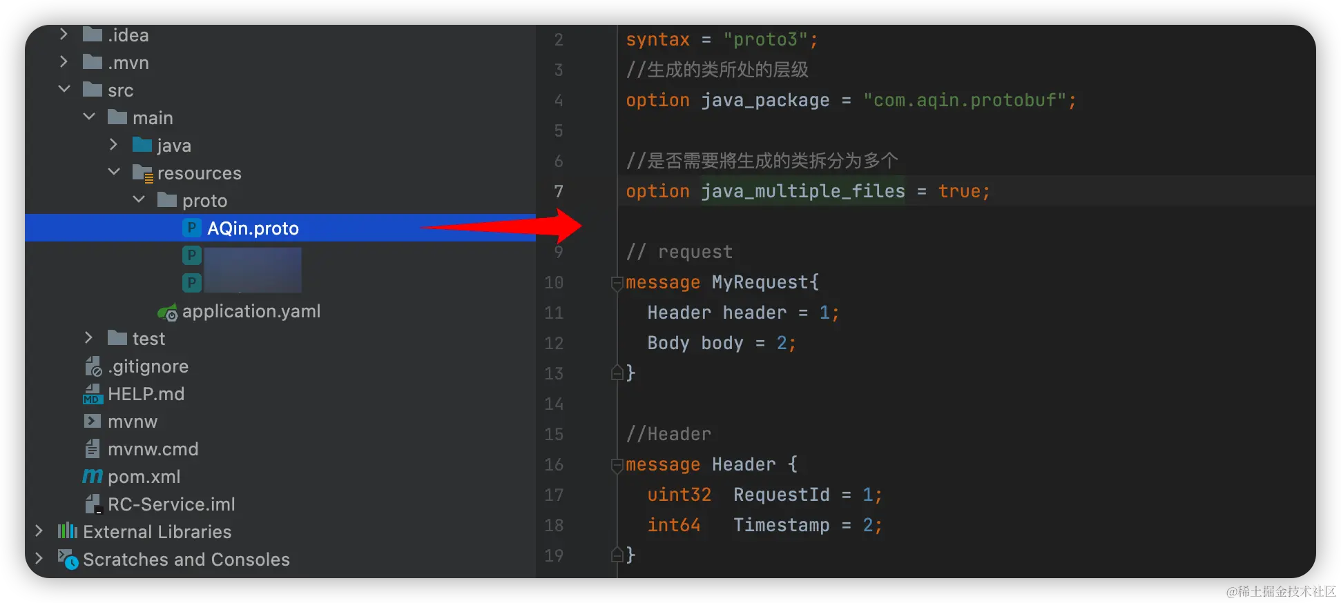 其中 syntax = "proto3" 表示协议版本,option java_package = "com.aqin.protobuf" 表示生成的类所处的层级,option java_multiple_files = true 表示需要將生成的类拆分为多个(false 的话就是不需要),MyRequest 和 Header 是消息结构。