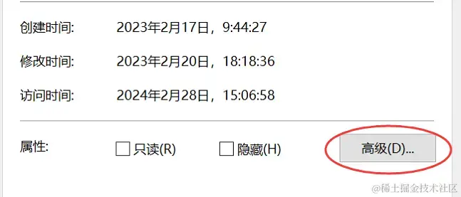 步骤2:右键点击该文件夹,选择【属性】,在弹出的属性窗口中,点击【高级】 ;
